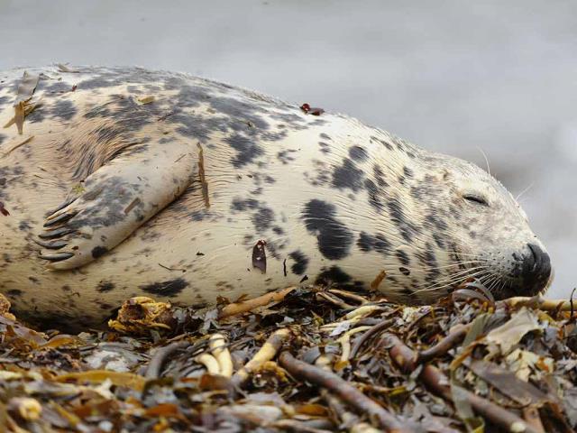 在海滩上睡觉的灰海豹, 奥克尼群岛, 苏格兰